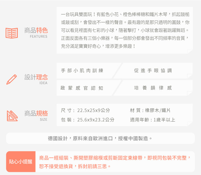 ▪️ 正反面各有三個小樂器,會發出不同頻率的音質 ▪️ 充分滿足寶寶好奇心,增添更多樂趣