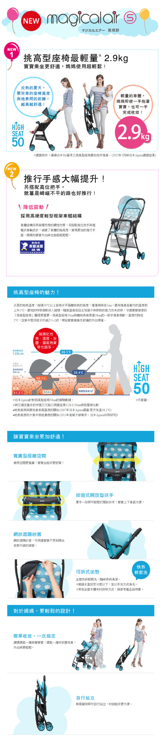 ▪️ 與離地表高度僅38cm的一般手推車相較,溫度約降低2℃,空氣中懸浮粒子光,甚至是強風的吹襲。約減少1~2成,帶給寶寶健康及舒適的外出環境。
