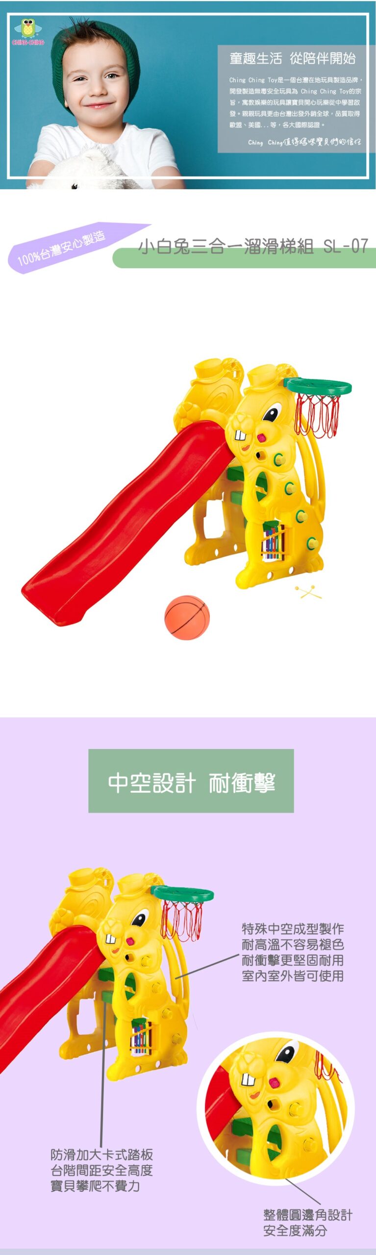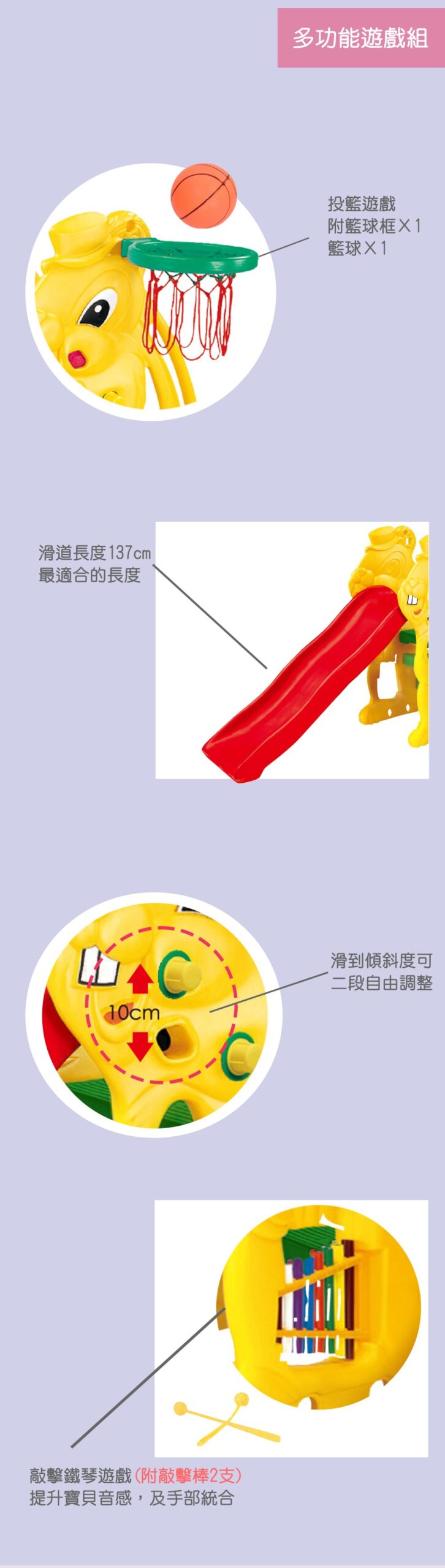 ▪️ 滑梯長度137公分,邊緣採原角設計,無論室內室外皆適合,附籃球框+籃球網+管弦樂器