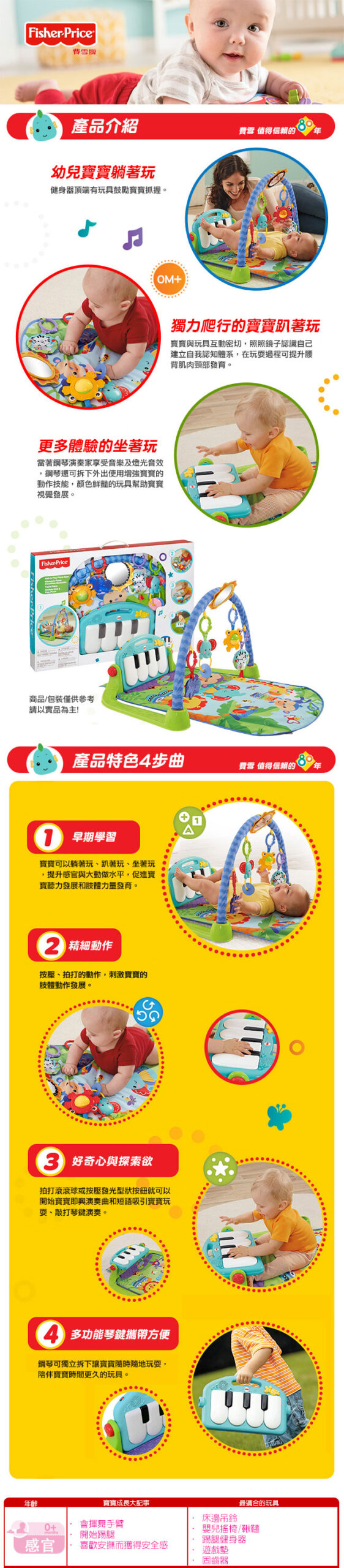▪️ 坐著玩:當著鋼琴演奏家享受音樂及燈光音效,鋼琴還可拆下外出使用增強寶寶的動作技能,顏色鮮豔的玩具幫助寶寶視覺發展。