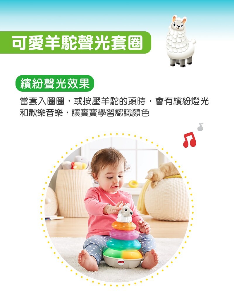 孩子可以從繽紛的燈光、歡樂的音樂中學習認識顏色。只要將彩色圈圈套到可愛羊駝的身上,或輕輕壓下可愛羊駝的頭,精彩的派對就開始囉!
