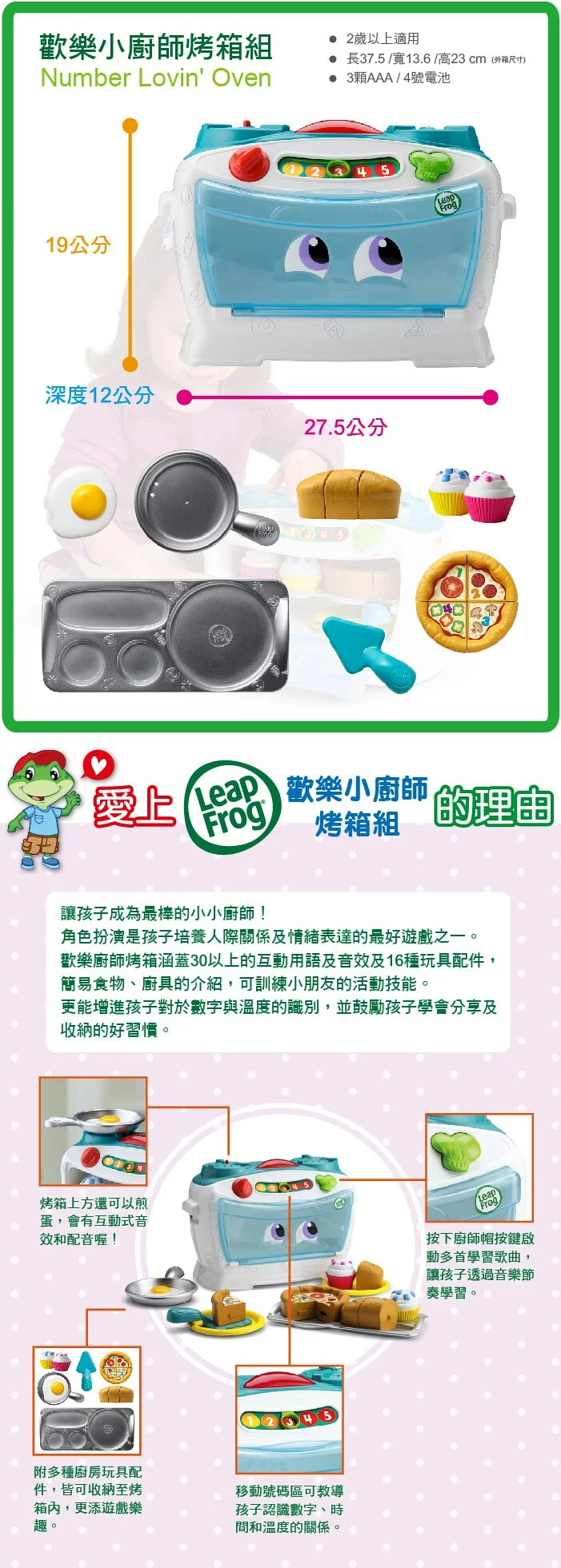 ▪ 歡樂小廚師烤箱涵蓋30以上的互動用語及音效及16種玩具配件,