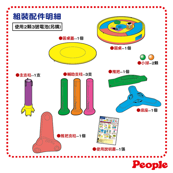 | 配件清單 | 球球x2、輔助支柱x3、底座x1、說明書 推把x1、推把支柱x1、圓桌x1、桌蓋x1 主支柱x1 |