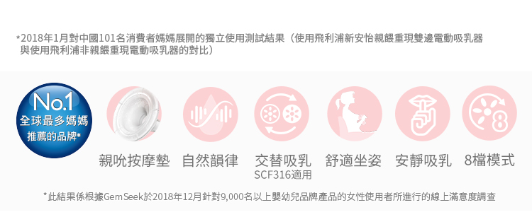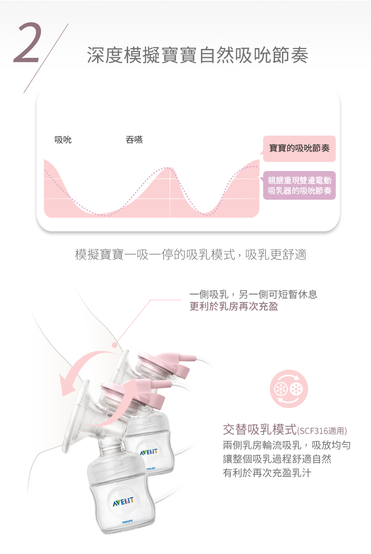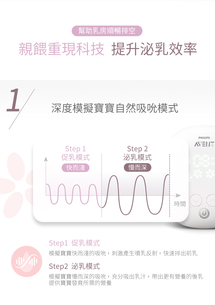 ▪️ 模擬寶寶吮吸兩階段-親餵重現科技:先快而淺的吸吮「促乳模式」,再慢而深的「泌乳模式」,充分吸出乳汁,帶出更有營養的後乳,數據證實有效提升32%泌乳量、10%奶陣。