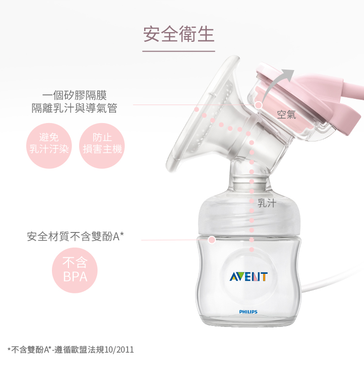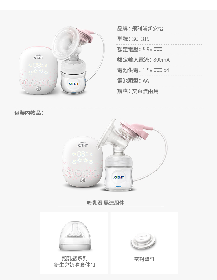 | 配件清單 | 喇叭罩x1、鴨嘴x1、電源線x1、儲乳瓶x1、傳導片吸力管x1 喇叭口護蓋x1、矽膠隔膜x1、儲乳瓶x1、按摩護墊x1 |