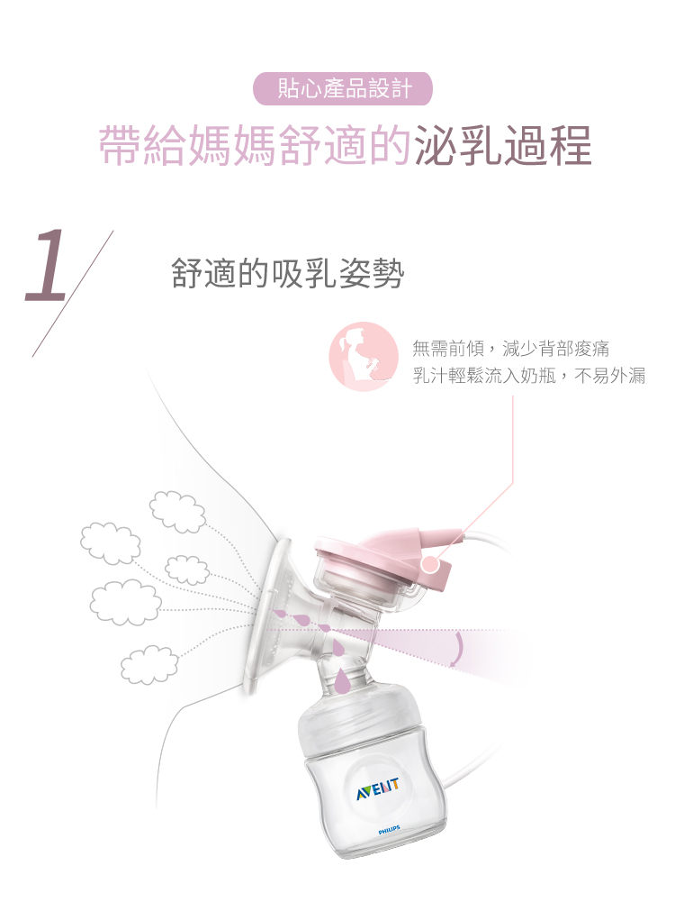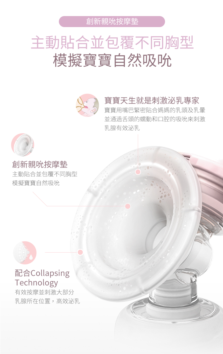 ▪️ 創新親吮按摩墊:主動貼合並包覆不同胸型,按摩墊有效按摩並刺激大部分乳腺位置,泌乳更有效率。