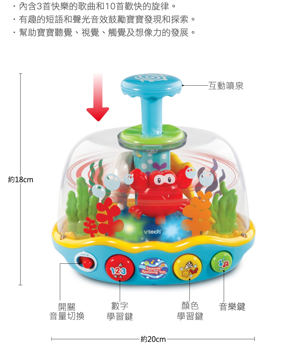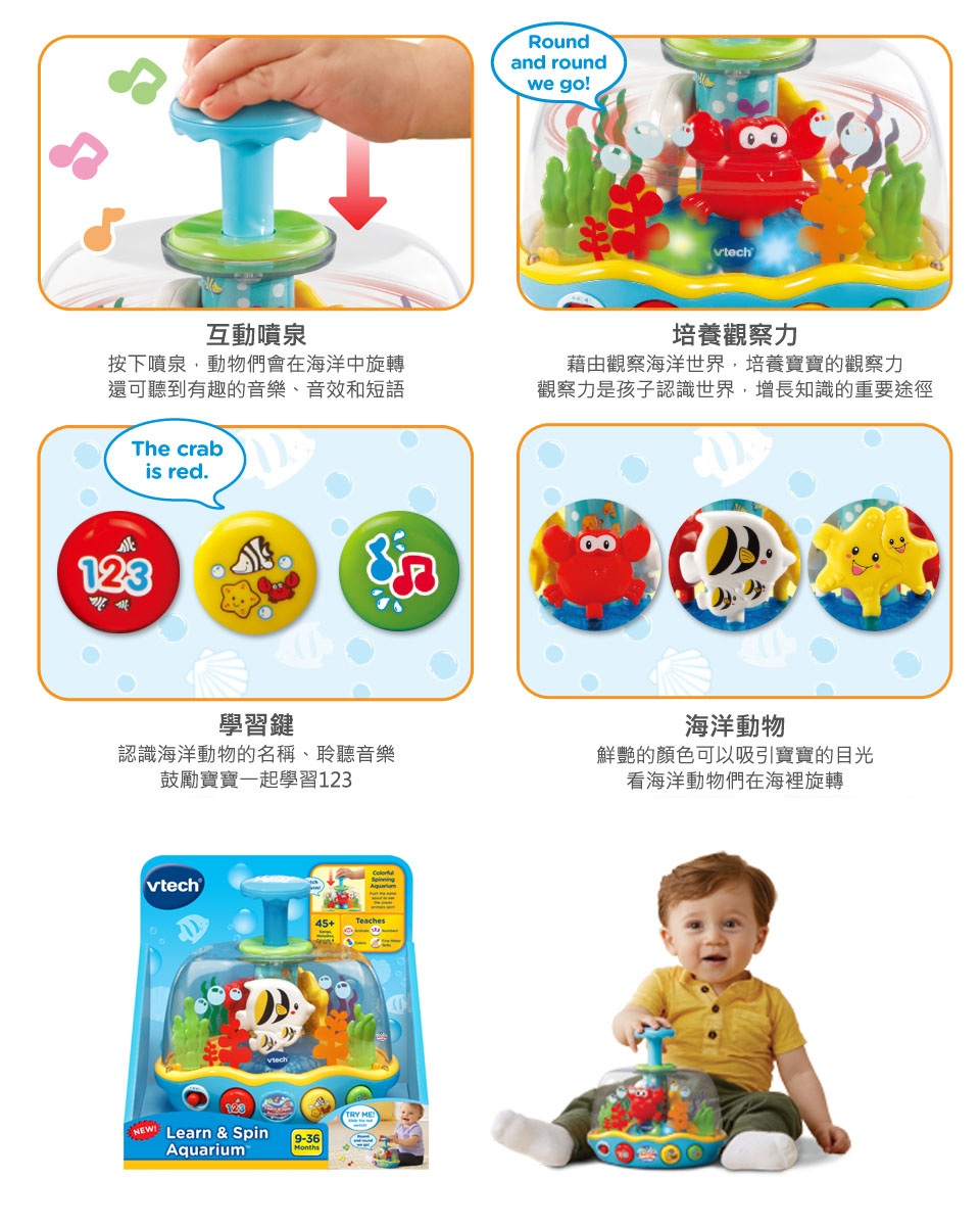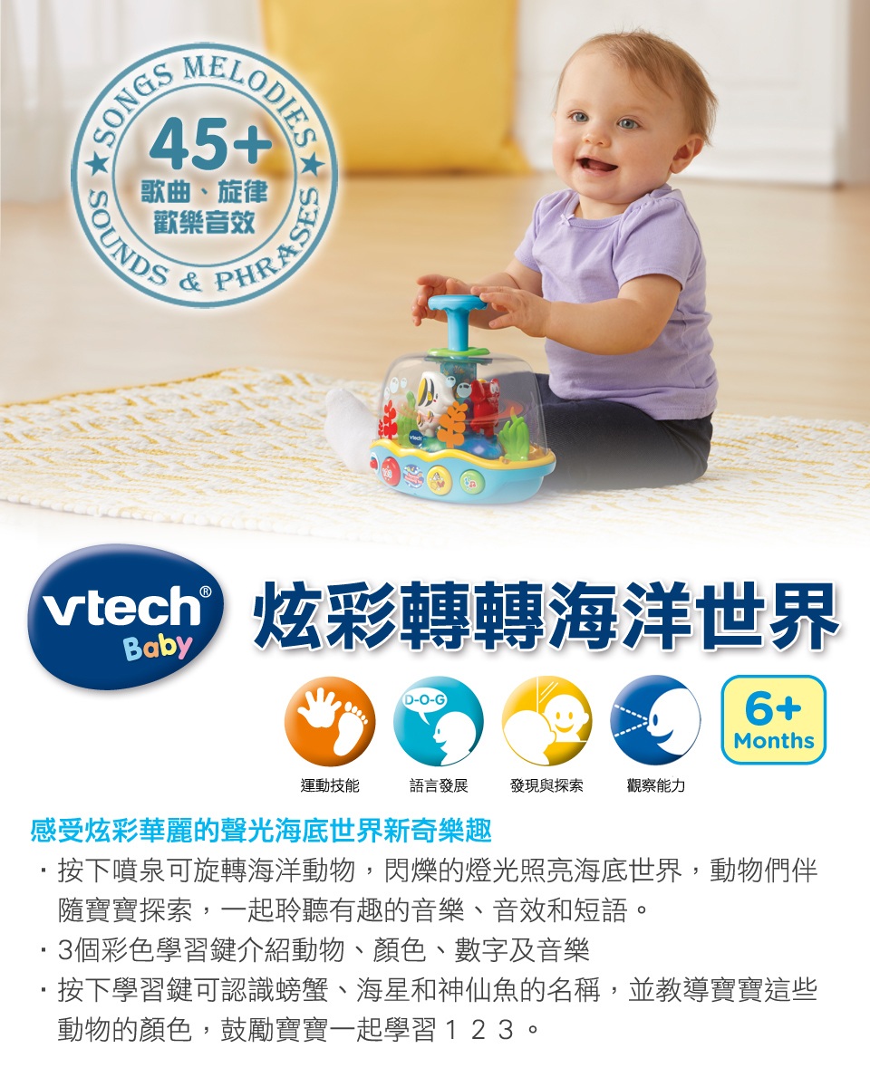 ▪️ 按下噴泉可旋轉海洋動物,閃爍的燈光照亮海底世界,動物們伴隨寶寶探索,一起聆聽有趣的音樂、音效和短語。
