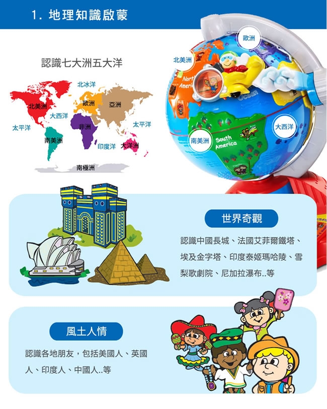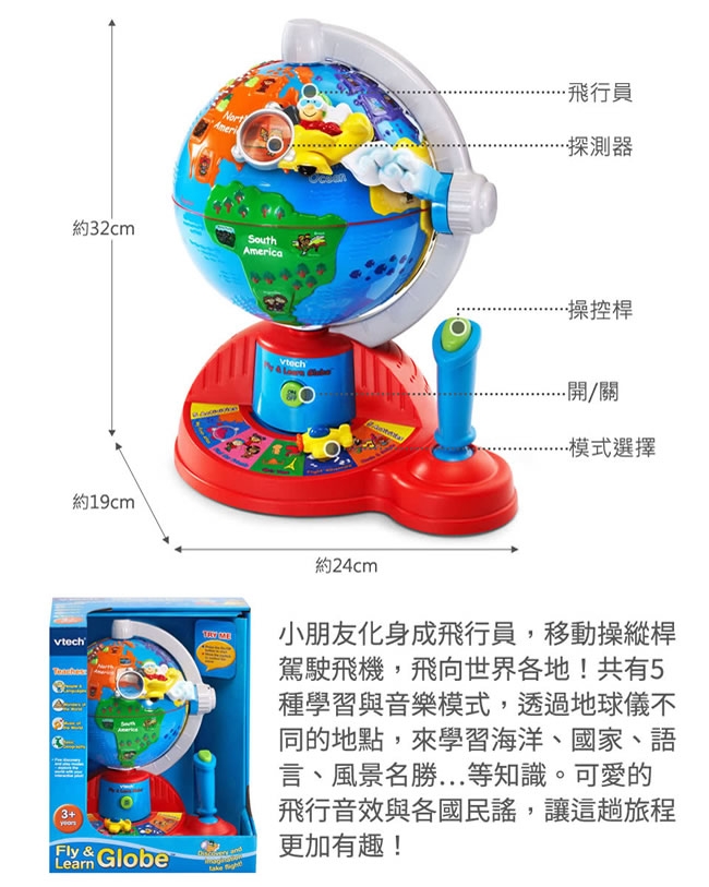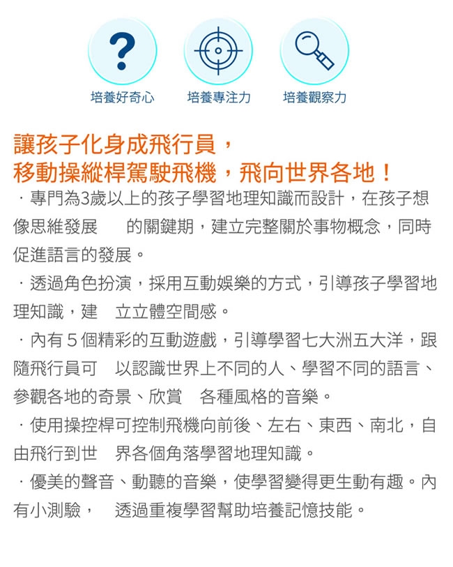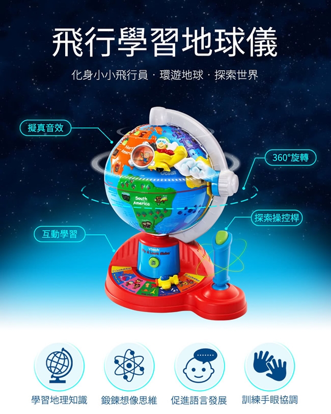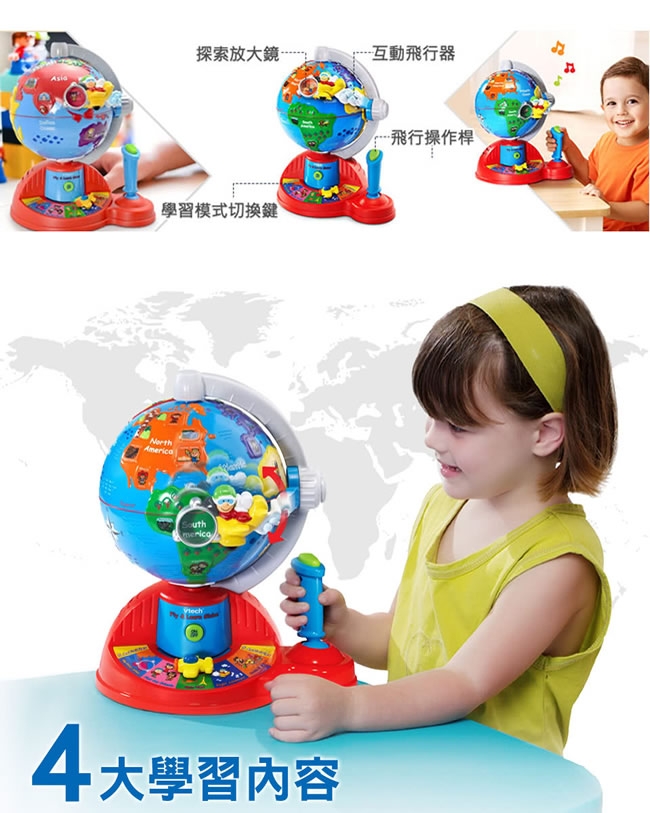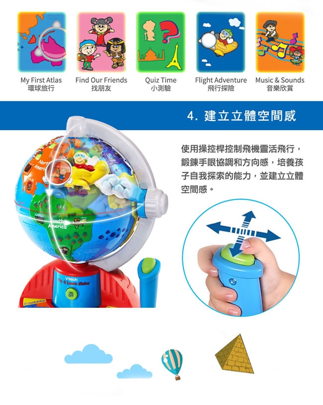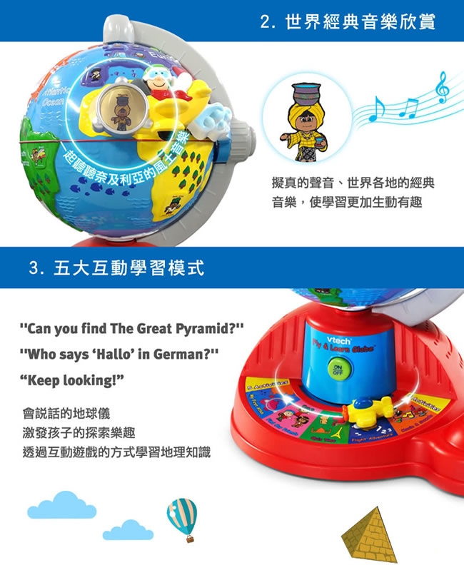 ▪️ 準備!奇妙的旅程開始了!讓小朋友化身成飛行員,移動操縱桿駕駛飛機,飛向世界各地!共有5種學習與音樂模式,透過地球儀不同的地點,來學習海洋、國家、語言、風景名勝…等知識。可愛的飛行音效與各國民謠,讓這趟旅程更加有趣!