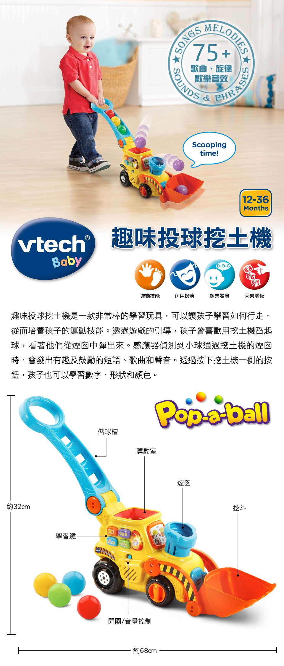 ▪️ 感應器偵測到小球通過挖土機的煙囪時,會發出有趣及鼓勵的短語、歌曲和聲音