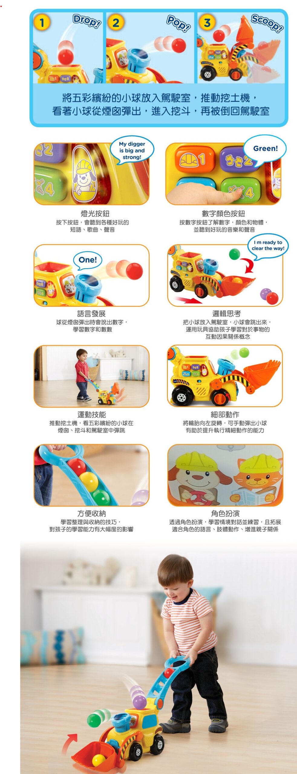 ▪️ 透過按下挖土機一側的按鈕,孩子也可以學習數字,形狀和顏色。