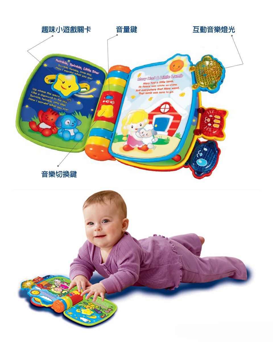 ▪️ 當寶寶翻開每一頁時,都會有活潑可愛的兒歌還有閃爍著燈光的笑臉,吸引寶寶想要一玩再玩