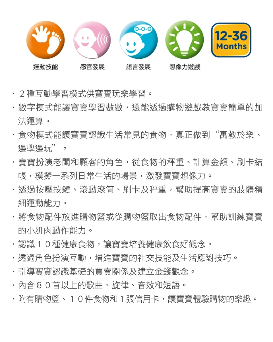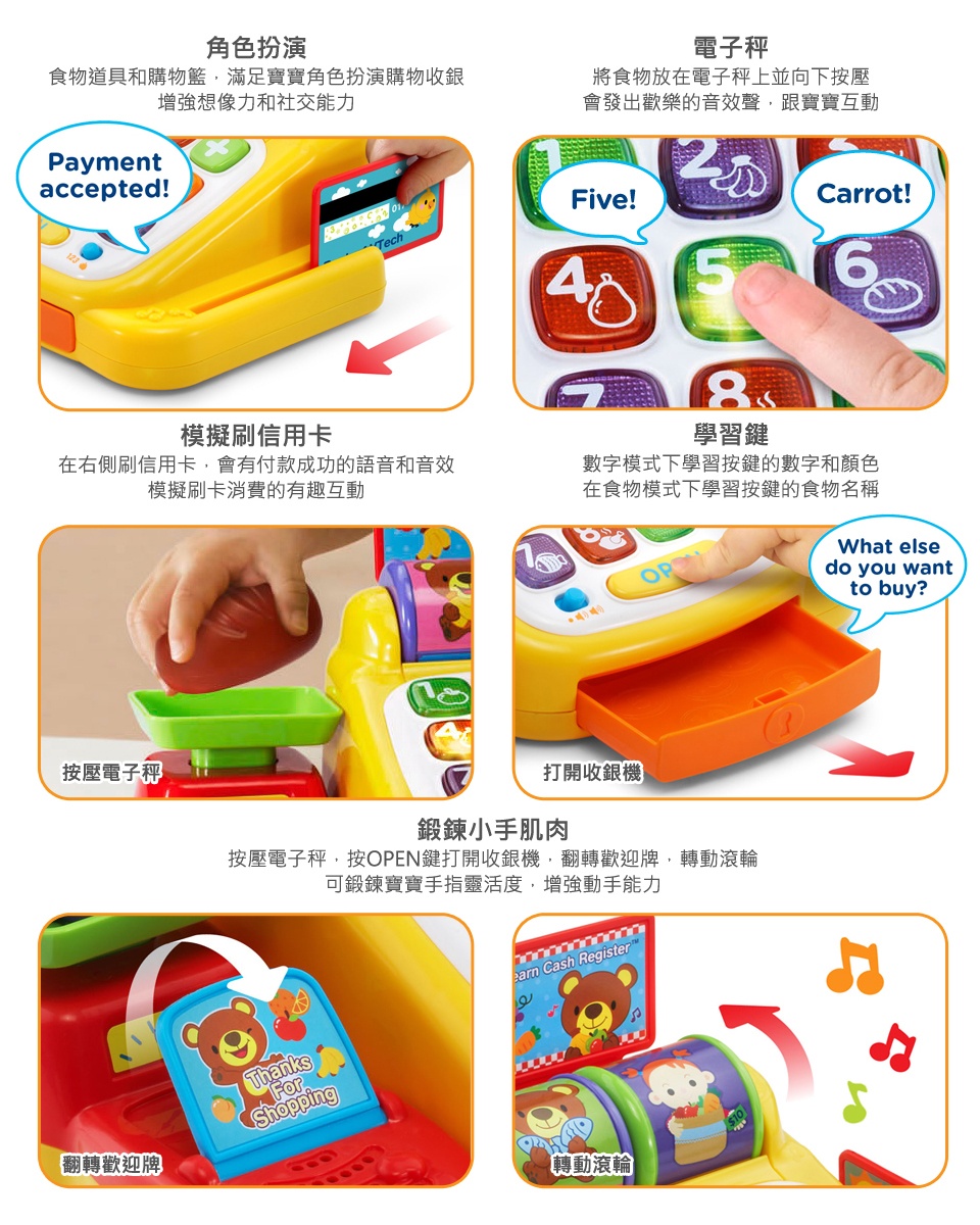 ▪️ 寶寶扮演老闆和顧客的角色,從食物的秤重、計算金額、刷卡結帳,模擬一系列日常生活的場景,激發寶寶想像力。